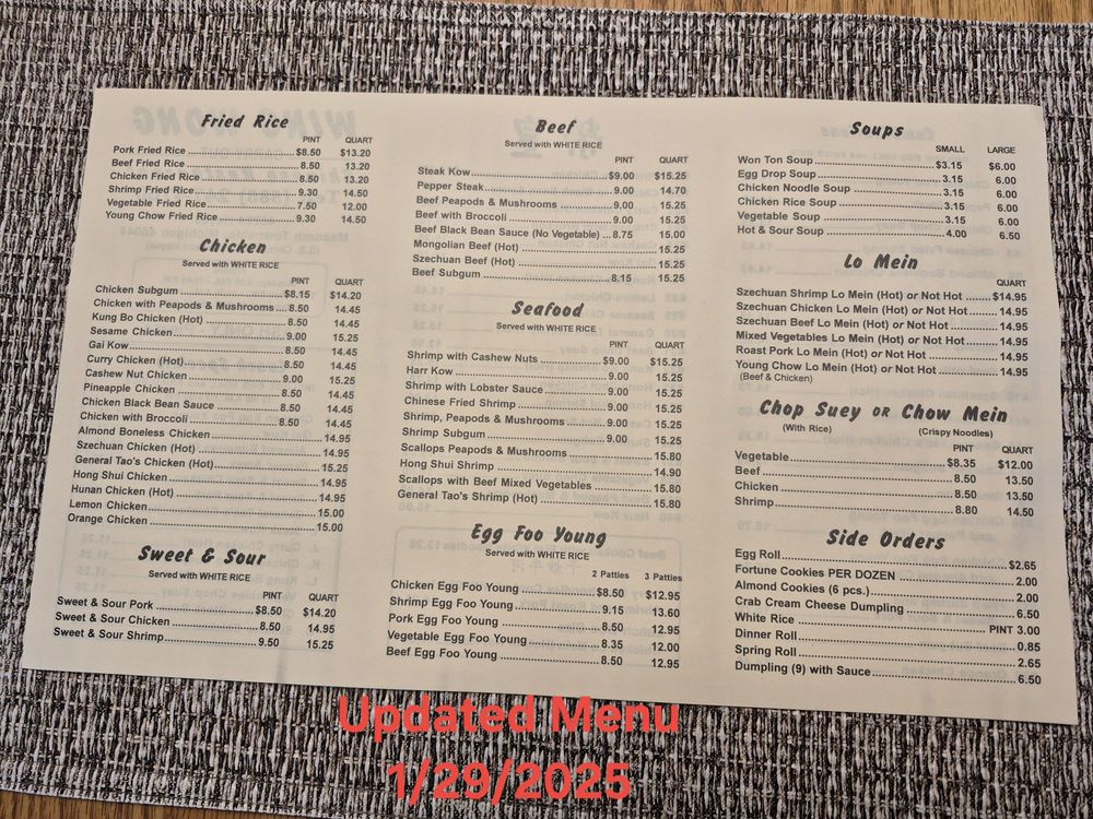 Wing Wong specializes in an impressive array of dishes, with highlights including their flavorful Fried Rice options, such as the Pork and Shrimp Fried Rice, each made with fresh ingredients and vibrant vegetables. The Soups, starting at just $2.15, provide a comforting start to your meal, with classics like Won Ton and Hot and Sour Soup.